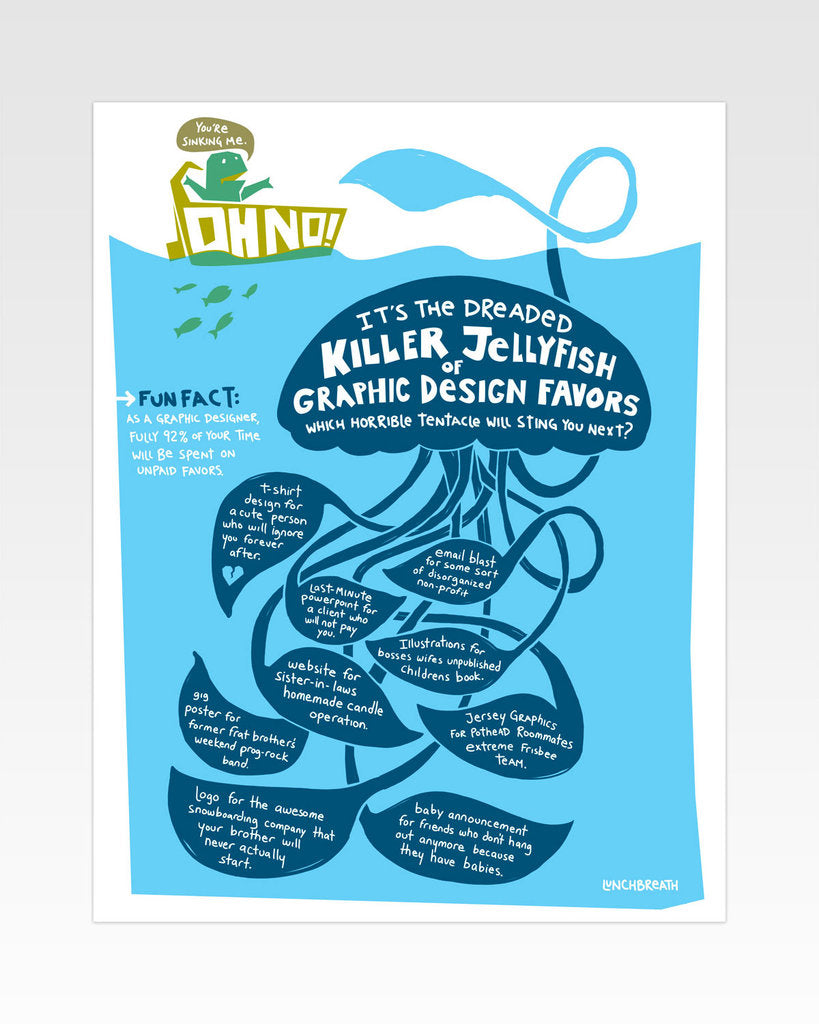 Beware what lurks beneath the surface of a graphic design career. The Dreaded Killer Jellyfish of Graphic Design Favors silkscreen print by lunchbreath will remind you of all those "small favors" you get asked to do and why you should say "no."