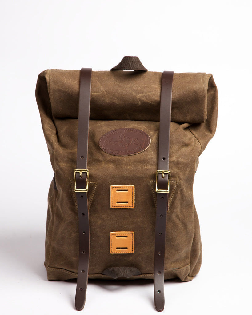 Durability and versatility go together in this new backpack design. The waxed cotton top-roll style keeps water out easily and compresses neatly when the load is low, but allows quick attachment of even bulky loads. The roll-top also sports heavy snaps, to keep your delicates safe even when unrolled or packed to the gills. Heavy stitched leather tabs provide extra lashing points and a little pop of color - good for carabiners or bike lights. Inside you've got a hanging zippered pocket for small thing organization. Outside are two slip pockets for anything you need close at hand, grommeted to keep water (or spiders, or pine needles) from collecting. The thick pistol belt cotton web shoulder straps distribute weight well, and hang comfortably from a central yoke ring which prolongs their fatigue life and looks suave.