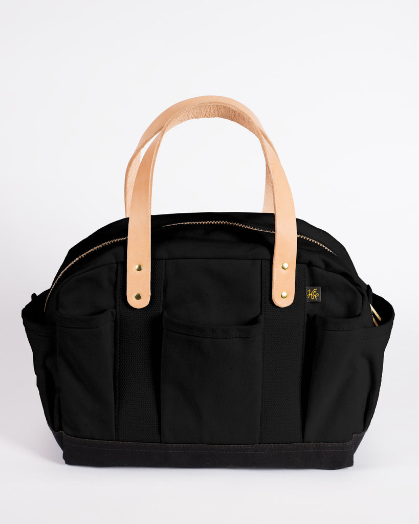 A little canvas and leather can get a crap ton done, and our new mechanic’s bag is ready to be your tough new sidekick. This tote is flat-bottomed and big hearted, long like a toolbox and nice and light like a carry-all should be. These cool tool bags have a distinctive profile, designed to comfortably hold tools while they stand up by themselves. The double-layer bottom gives stiffness plus coverage, eight easy-access pockets keep the small stuff sorted, and the wide mouth top makes even long and weird tools easy. The brass zipper is heftily double stitched. The canvas is thick, all the edges well-finished, and the interior features taped seams to keep it all clean. Leather straps are thick, and riveted for durability. Leather grips will only get better with age and exposure to your dirty mitts. And as always, made in the USA.