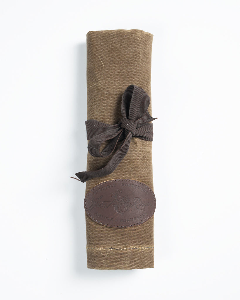 The Frost River Utensil Roll uses waxed canvas, premium leather, heavy waxed thread and solid brass hardware for their strength, water-resistance and long-life. It offers seven pockets, a band of heavy elastic, a full flap and a heavy tie to keep your vital items safe. It rolls up securely or folds flat. Brass grommets at the corners let you string it up for ease of use while camping or working. Good for camping, cooking, wood-working, biking, art-making tools, or anything else you want to keep organized and snug.
