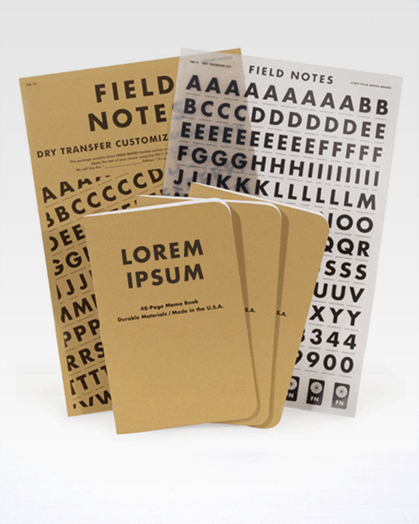 Relive the golden age of graphic arts and command the power of 36-point Futura Bold using our FN-11 Dry Transfer Kit and the FN-11B Application Template (click here for template and detailed instructions). Kern and align carefully for the authentic FIELD NOTES look, or go crazy with “creativity” and make the damn thing look like a Bay City Rollers fanzine. No one can stop you.