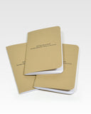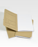 Each kit includes three blank FIELD NOTES (French Dur-O-Tone 80# “Packing Brown Wrap” covers with “Double Knee Duck Canvas”-lined graph paper), one sheet of transfer lettering, a burnishing stick, and an instruction card.
