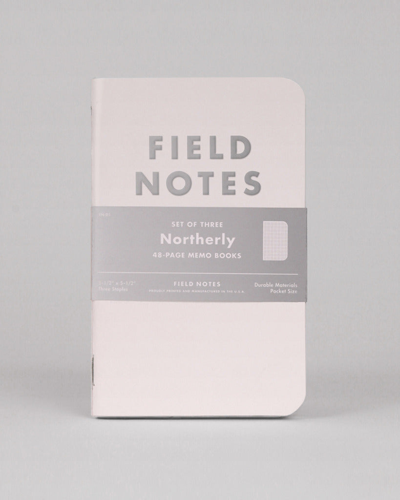 The thirteenth FIELD NOTES COLORS release, for Winter 2011, is called “The Northerly Edition,” and as always, the folks at Field Notes have tested out a few new ideas. “Northerlies” feature the first-ever coated cover, and it couldn’t be glossier: cast-coated, snow-white Mohawk/Smart Kromekote, milled and finished in Cohoes, New York. The covers feature “Icy Silver” type with an embossed FIELD NOTES logomark.