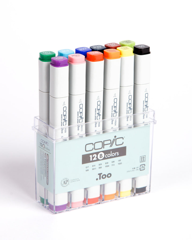 Inside or outside the lines, Copic markers are the way to color your designs. The masters of pigment at Copic got the ink formula right 25 years ago, and haven't changed it since. The alcohol-based ink won't tear up the page the way water-based markers can, so the colors can be layered and blended more easily. Go on, test it yourself with this 12-marker set that contains all the basic colors you'll need. The ink formula is low-odor and waterproof. Tired of throwing away your markers when they run dry? The ink and nibs on Copic markers are replaceable, so the body can be reused again and again.