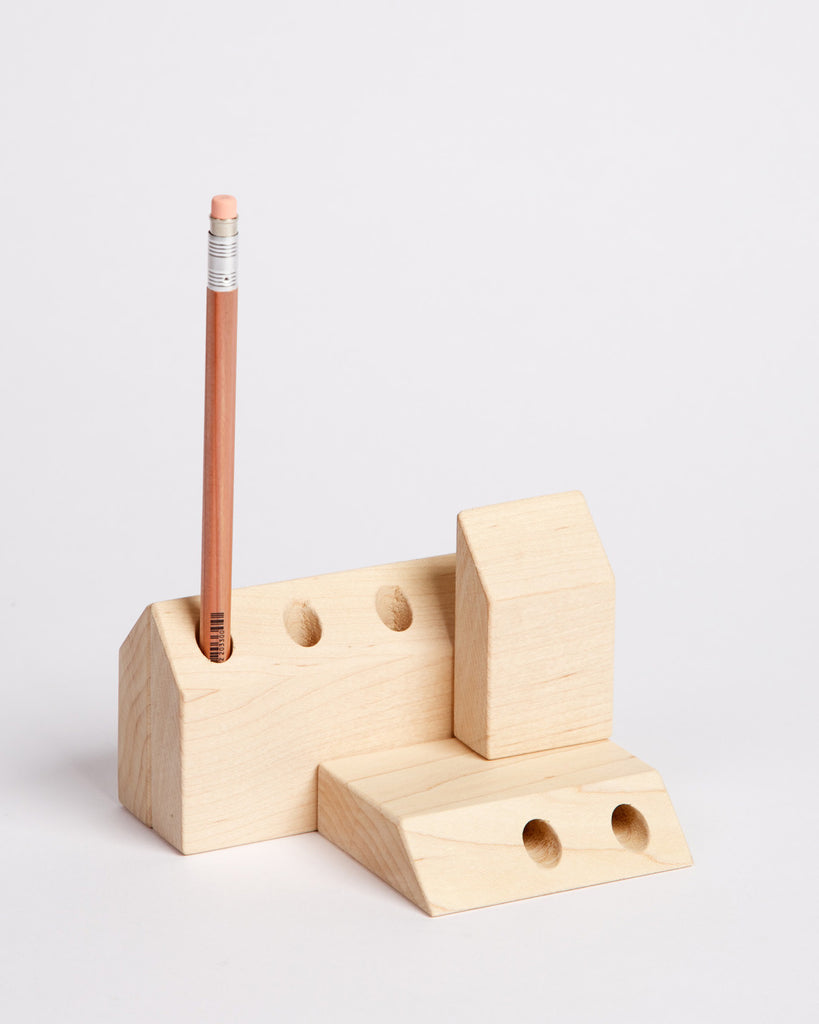 Play landlord with your writing tools, and tread the line between work and play with these Village Desk Accessories. This modular set of 4 wooden blocks are made to live on your work desk as a functional pen holder with a subtle whimsy that invites you to play while at work. City block? Distant bucolic country farms? Stack them up, knock them down, and rebuild your desk neighborhood again.