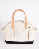 A little canvas and leather can get a crap ton done, and our new mechanic’s bag is ready to be your tough new sidekick. This tote is flat-bottomed and big hearted, long like a toolbox and nice and light like a carry-all should be. These cool tool bags have a distinctive profile, designed to comfortably hold tools while they stand up by themselves. The double-layer bottom gives stiffness plus coverage, eight easy-access pockets keep the small stuff sorted, and the wide mouth top makes even long and weird tools easy. The brass zipper is heftily double stitched. The canvas is thick, all the edges well-finished, and the interior features taped seams to keep it all clean. Leather straps are thick, and riveted for durability. Leather grips will only get better with age and exposure to your dirty mitts. And as always, made in the USA.