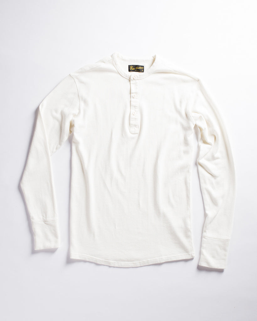 This long sleeved version of the Utility tee has the same slim fitting trunk and cat-eye button front, plus more coverage. The material is thicker than even gourmet t-shirts normally offer, and the brushed cotton interior is like a present to your body. A little cozy, very versatile.