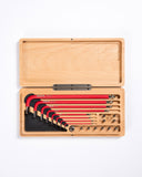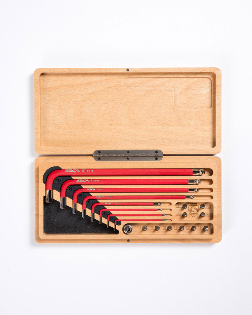 Silca has been known for outstanding attention to detail for almost 100 years, from tool design to precise production to excellent packaging. This set of immaculately cast and machined tools and their solid CNC milled beech wood case are designed to easy to use even with one hand, and built to withstand years of use.