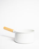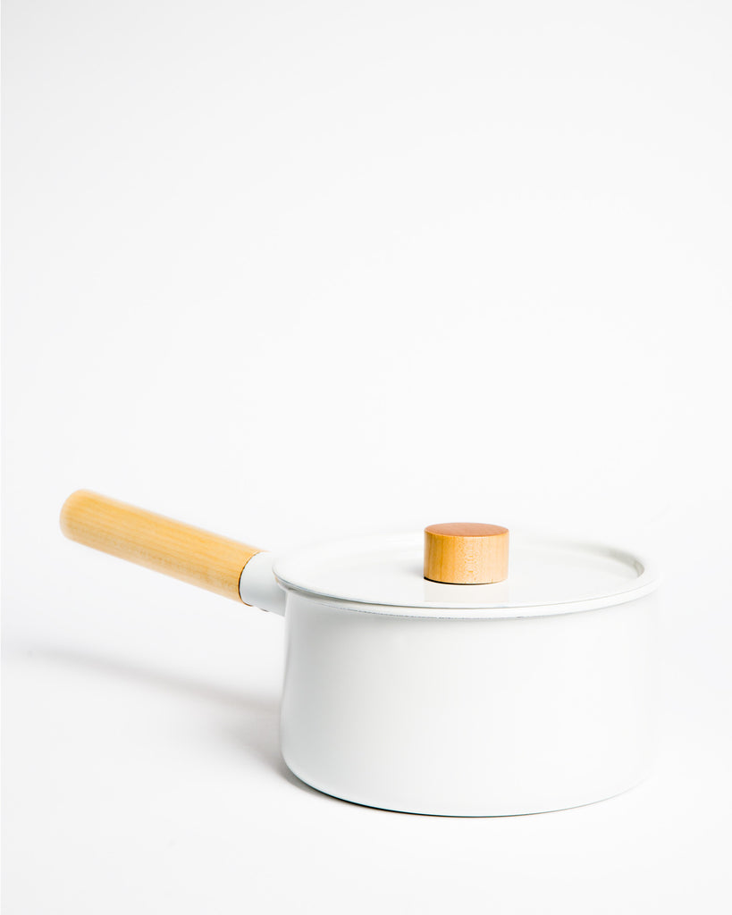 Cooking isn't a simple task, but some of the best tools are. The Kaico family of enamelware is deliciously minimal without skimping on usability. Clean, bright white enameled steel is paired with turned maple accents for a hard/soft blend that is tactile, inviting, and easy to use. Enamel distributes heat nicely, cleans easily, and is a durable and traditional material. The long wood handle doesn't transfer heat (your hands will thank you), and is a nice comfortable width. This size is great for sauces and small sautés. The profile is elegant and understated, but it won't hold you back from your wild creations.