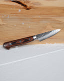 Midori Hamono knives set a stellar example for pragmatic tools made beautifully. Handmade in Japan, the blade has a professional grade VG-10 stainless core with 15 layers of laminated stainless Damascus cladding, and a "tsuchime" or hammer marked finish. The dappling of the hammer marks prevent materials from sticking to the side of the knife. The 4 inch blade is a western-style full tang, strong against rust and easy to sharpen. The handle is mahogany, triple pinned, well weighted and high polished for hand comfort. A paring knife is an important tool for deft cuts and quick, safe hand work. Comes in a beautiful, giftable box.