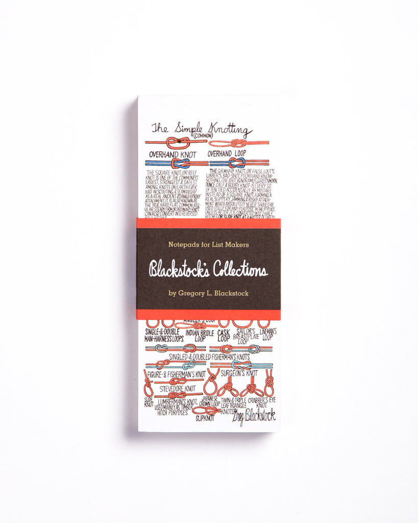 "Inspired by our bestselling book Blackstock's Collections, these reporter-style notepads feature the obsessively detailed visual lists of artist Gregory L. Blackstock from party noisemakers to tools and sailing knots. These lined notepads are perfect for recording daily to-dos, dashing off grocery items, or doodling everyday objects. Designed in a slim, list-style format, with a sturdy backing and perforated sheets, Blackstock's Collections Notepads are easy to use while on the go."