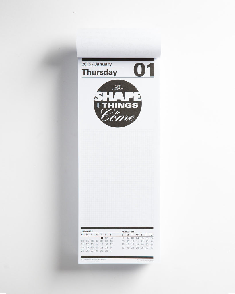The Ryan McGinness Calendar is back for 2015! Ryan McGinness self-published these unique To-Do list calendars for his personal use for years, and the 2015 calendar is the perfect resource for any artist, designer, or dedicated list-maker to have on their own desk. This year the style is heavily graphic, with weird text art as your inspiring header for the day. The lightly gridded space of each page is a blank slate for everything from points of business and grocery lists to inspired scribbles or quotes from movies you direct in your head.