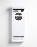 The entire Calendar To-Do List Pad is printed in one color: 100% black on uncoated paper. The pad is bound along the top and is packaged in a box with a black ribbon attached to the bottom of the inside to assist in removing the pad. The box lid goes under the box base and can be used to store completed calendar days. At the end of the year, when the box is filled with the entire year’s to-do lists, the entire package can be shelved for archiving purposes. Each day features a different graphic arrangement in a large circle at the top center of each day’s page, with 365 unique pages total. This circle is echoed with a smaller dot positioned over the day within a view of the entire month (and subsequent month) printed at the bottom of each page.