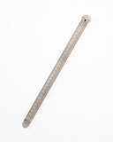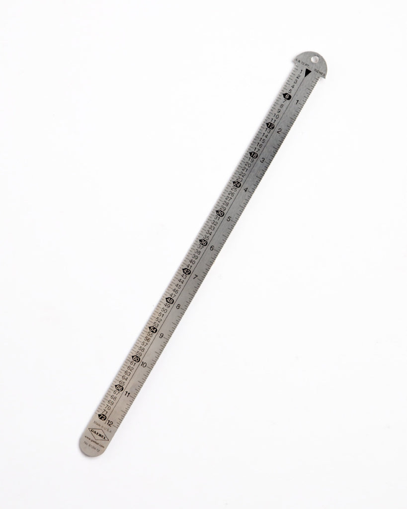Lovers of lettering, rejoice. The printer's line gauge is here to set your records straight. Notched top to catch the edge of your paper or work surface, these rulers provide the minute markings you need for painstaking alignment work. In addition to a host of measurement options (inches, millimeters, picas! 6 and 12 point!) you get a center line on a stainless steel base thick enough to stay as stiff as you need.