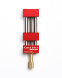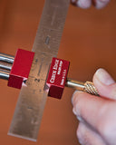 The Czeck Edge Ruler Stop gives rulers the capability of repeatable, accurate measurement from a fixed edge. In other words, this is a sweet DIY-style adjustable pocket square. The ruler stop jaws and body are precision machined from aircraft grade aluminum and are 1/2" X 1" wide. The tool length is 3 7/8". The 1" width makes measurement tracking easy - not too big to see around, not too small to handle. The 1/4" diameter steel guide rods are hardened, ground and polished, and the screw is stainless steel. The longish knob stem is easy to use with the thumb and index fingers.