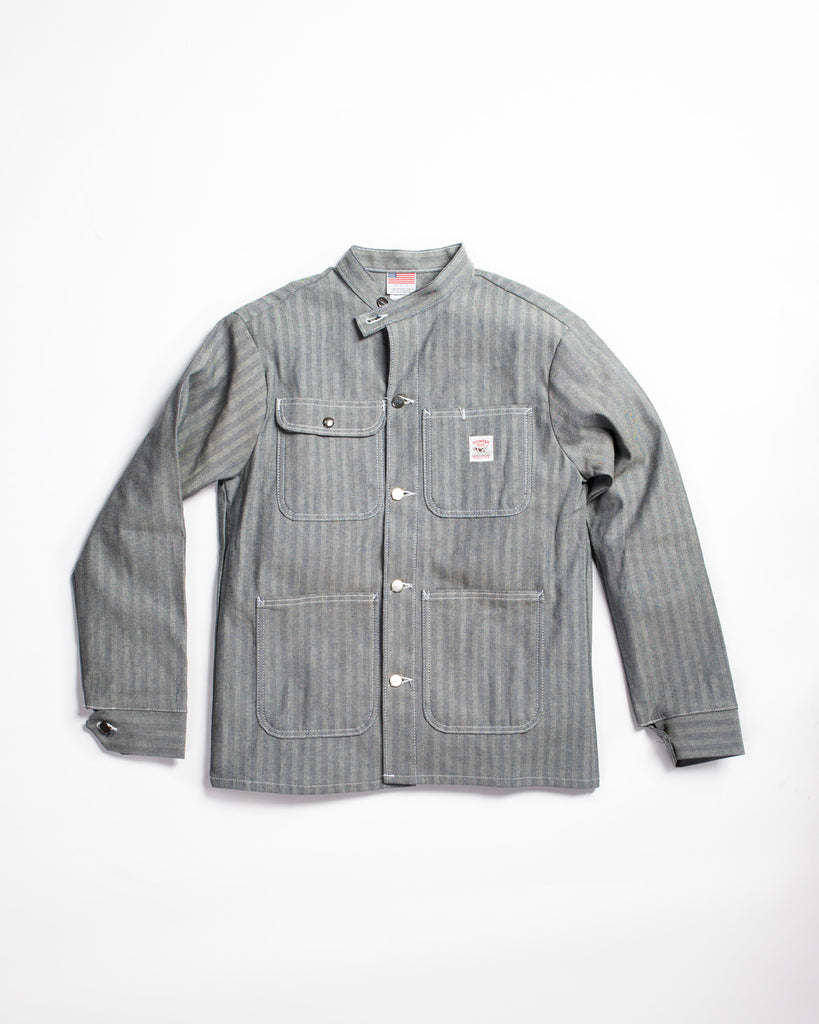 This Pointer Brand Banded Collar Jacket is a revamp of the classic Pointer Brand Chore Coat. The larger Chore Coat wing collar has been replaced with a small standing band. Like the original version the Banded Collar version is constructed from quality material, your choice 100% Cotton Duck, Hickory Stripe, Fisher Stripe, Indigo Blue Denim or White Drill and features four large pockets, including a pocket that buttons and a pencil holding stitch on the left side.